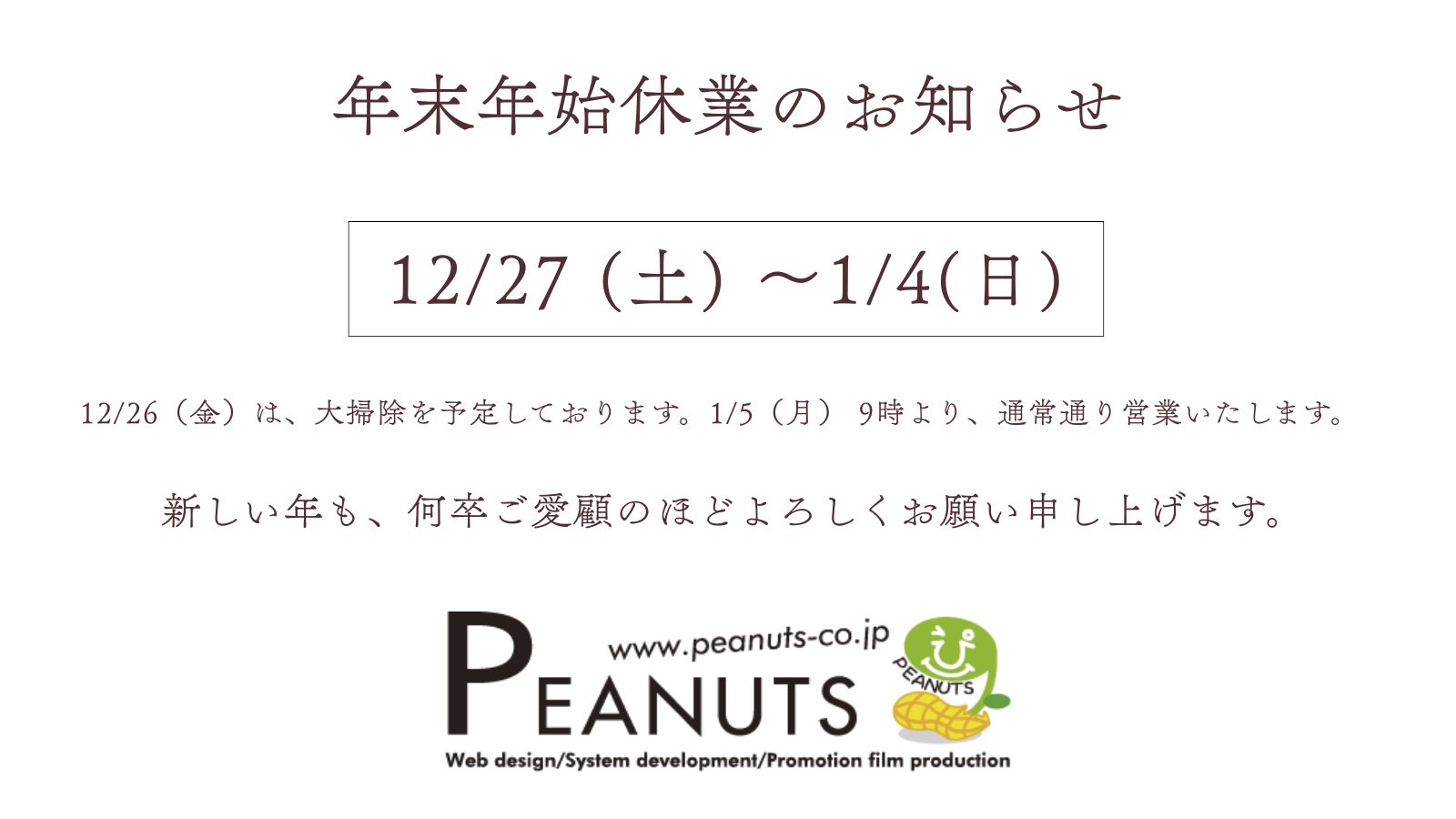 2025.12.24 年末年始休業期間のお知らせ 平素は格別のご高配を賜り、厚くお礼申し上げます。 本年度の年末年始につきまして、下記の通り休業させていただきます。 ・年末年始休業日 2025年12月27日(土)~2025年1月4日(日) ※12/26は、大掃除を予定しております。 1月5日(月)9:00より、通常通り営業いたします。 大変ご迷惑をおかけしますが、何卒よろしくお願いいたします。 新しい年も、何卒ご愛顧のほどよろしくお願い申し上げます。 一覧へ 前へ >