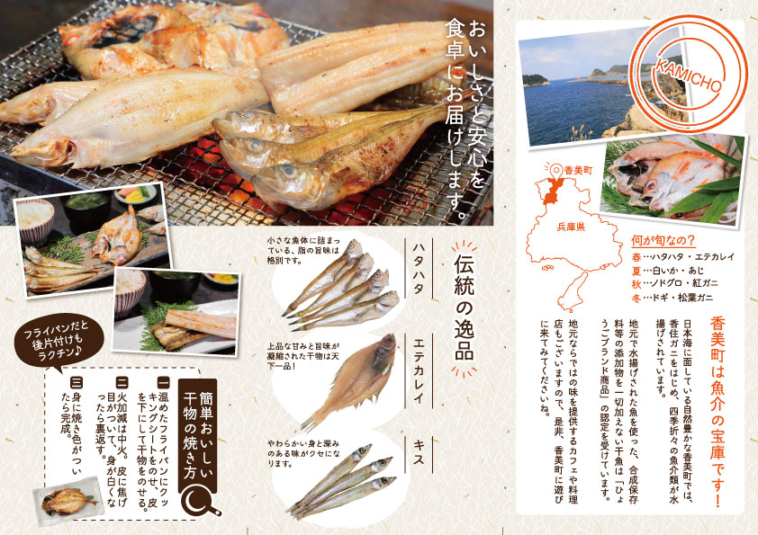 漁業が盛んな香住の地で、干物を生産している丸松西上商店様のパンフレット制作に携わらせていただきました。